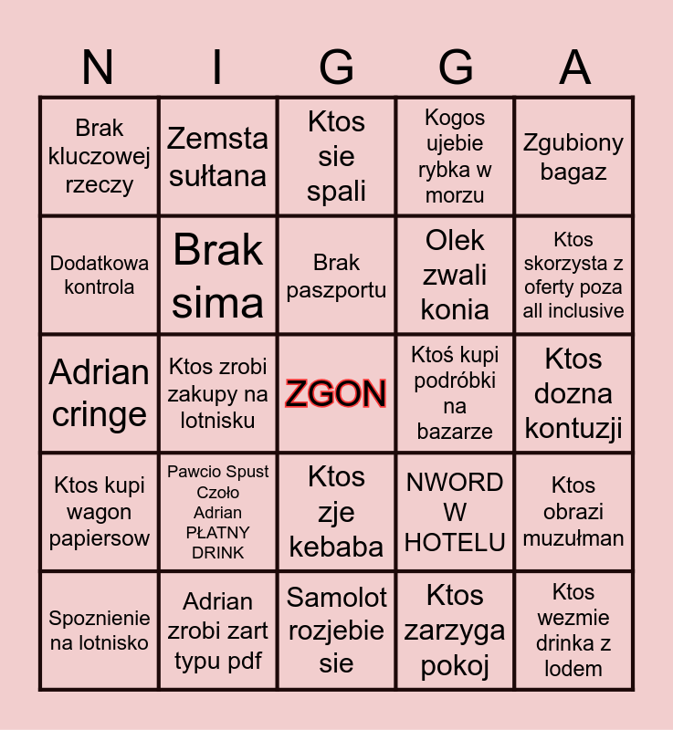 This bingo card has a free space and 24 words: Pawcio Spust Czoło Adrian PŁATNY DRINK, Adrian zrobi zart typu pdf, Brak paszportu, Spoznienie na lotnisko, Zgubiony bagaz, Brak kluczowej rzeczy, Dodatkowa kontrola, Zemsta sułtana, Ktoś kupi podróbki na bazarze, Ktos zje kebaba, Olek zwali konia, Adrian cringe, NWORD W HOTELU, Ktos obrazi muzułman, Brak sima, Ktos zarzyga pokoj, Ktos dozna kontuzji, Ktos sie spali, Ktos skorzysta z oferty poza all inclusive, Ktos zrobi zakupy na lotnisku, Ktos wezmie drinka z lodem, Ktos kupi wagon papiersow, Kogos ujebie rybka w morzu and Samolot rozjebie sie.