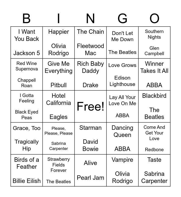 This bingo card has a free space and 69 words: Here Comes The Sun The Beatles, Blackbird The Beatles, With A Little Help From My Friends The Beatles, Octopus's Garden The Beatles, Strawberry Fields Forever The Beatles, In My Life The Beatles, Don't Let Me Down The Beatles, I Feel the Earth Move Carole King, Southern Nights Glen Campbell, Dog Days Are Over Florence + The Machine, Come And Get Your Love Redbone, Spirit in the Sky Norman Greenbaum, I Want You Back Jackson 5, The Chain Fleetwood Mac, Zombie Cranberries, Hotel California Eagles, Starman David Bowie, Love Grows Edison Lighthouse, Should I Stay or Should I Go The Clash, Grace, Too Tragically Hip, Lay All Your Love On Me ABBA, Dancing Queen ABBA, Winner Takes It All ABBA, Waterloo ABBA, Reminiscing Little River Band, Landslide Fleetwood Mac, The Great Gig In The Sky Pink Floyd, August Taylor Swift, Vampire Olivia Rodrigo, Brutal Olivia Rodrigo, Happier Olivia Rodrigo, Bad Idea Right? Olivia Rodrigo, Logical Olivia Rodrigo, Love Is Embarrassing Olivia Rodrigo, Can't Catch Me Now Olivia Rodrigo, Stick Season Noah Kahan, From the Start Laufey, Hot To Go Chappell Roan, Red Wine Supernova Chappell Roan, After Midnight Chappell Roan, Please, Please, Please Sabrina Carpenter, Taste Sabrina Carpenter, Sharpest Tool Sabrina Carpenter, Bed Chem Sabrina Carpenter, Lie To Girls Sabrina Carpenter, Birds of a Feather Billie Eilish, Good Days SZA, Toxic Britney Spears, Brazil Declan McKenna, Give Me Everything Pitbull, Rich Baby Daddy Drake, Hey Girl Zooey Deschanel, Natalie Bruno Mars, Alive Pearl Jam, Let It Go Frozen, I Saw Her Standing There The Beatles, Birthday Katy Perry, I Don't Wanna Wait David Guetta, One Republic, Let's Twist Again Chubby Checker, I Gotta Feeling Black Eyed Peas, We Can't Stop Miley Cyrus, Party In The U.S.A. Miley Cyrus, Good Vibes HRVY, Matoma, Return of the Mack Mark Morrison, California Love 2Pac, This Is How We Do It Montell Jordan, I Want It That Way Backstreet Boys, Cool Change Little River Band and It’s Too Late Carole King.