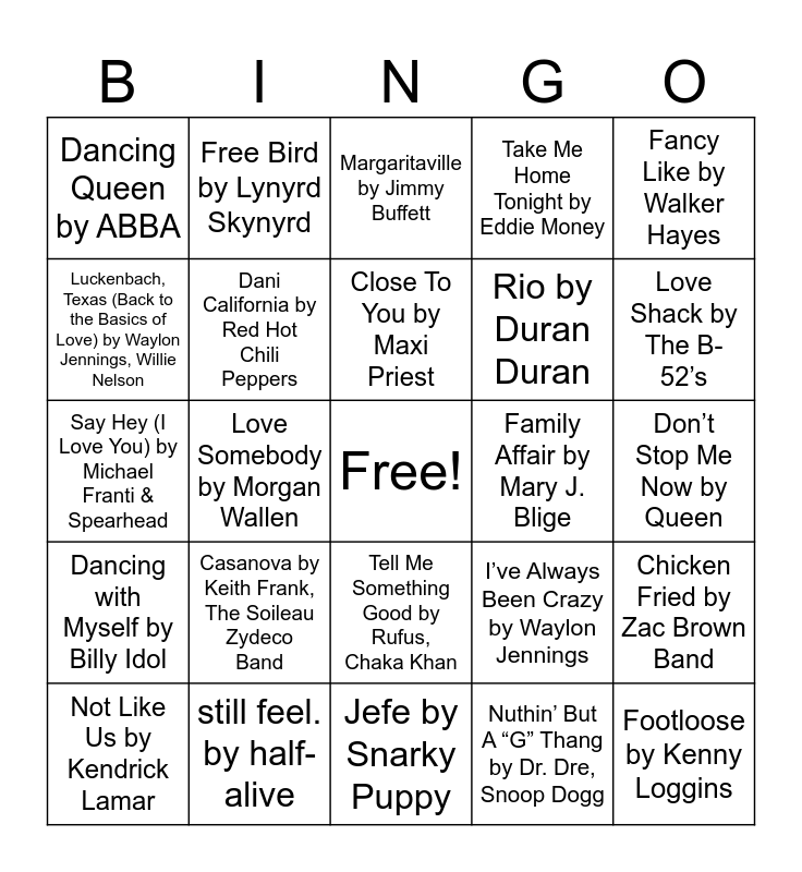 This bingo card has a free space and 80 words: Espresso by Sabrina Carpenter, Beers And Sunshine by Darius Rucker, Margaritaville by Jimmy Buffett, A Bar Song (Tipsy) by Shaboozey, Summertime by D.J. Jazzy Jeff & The Fresh Prince, 24K Magic by Bruno Mars, Uptown Girl by Billy Joel, Ocean Man by Ween, Cissy Strut by The Meters, Toes by Zac Brown Band, Let Your Love Flow by The Bellamy Brothers, I Wanna Dance with Somebody (Who Loves Me) by Whitney Houston, Take Me Home Tonight by Eddie Money, Dancing Queen by ABBA, Crazy In Love by Beyoncé feat. JAY-Z, Luckenbach, Texas (Back to the Basics of Love) by Waylon Jennings, Willie Nelson, One Particular Harbour by Jimmy Buffett, Casanova by Keith Frank, The Soileau Zydeco Band, Sade in the 90s by Qveen Herby, Don’t Stop Me Now by Queen, Kokomo by The Beach Boys, Fancy Like by Walker Hayes, Say Hey (I Love You) by Michael Franti & Spearhead, Close To You by Maxi Priest, Dani California by Red Hot Chili Peppers, You Make Me Feel Like Dancing by Leo Sayer, Fast Car by Luke Combs, Country Girl (Shake It For Me) by Luke Bryan, California Girls by The Beach Boys, California Gurls by Katy Perry, Snoop Dogg, Love Shack by The B-52’s, Sweetness by Jimmy Eat World, Jefe by Snarky Puppy, Island In The Sun by Weezer, Not Like Us by Kendrick Lamar, Family Affair by Mary J. Blige, Fame by David Bowie, Ain’t No Fun (If The Homies Can’t Have None) by Snoop Dogg, Nate Dogg, Warren G, Kurupt, Green-Eyed Lady by Sugarloaf, Footloose by Kenny Loggins, Amarillo By Morning by George Strait, September by Earth, Wind & Fire, 5 to 9 by Hudson Westbrook, APT. by ROSÉ, Bruno Mars, Boogie Shoes by KC & The Sunshine Band, Free Bird by Lynyrd Skynyrd, Margaritaville by Jimmy Buffett, Shambala by Three Dog Night, Ojitos Lindos by Bad Bunny, Bomba Estéreo, Walking in Memphis by Marc Cohn, Chicken Fried by Zac Brown Band, Love Somebody by Morgan Wallen, I’ve Always Been Crazy by Waylon Jennings, The Sweet Escape by Gwen Stefani, Akon, Windfall by Son Volt, Good Old Days by Macklemore, Kesha, TEXAS HOLD ‘EM by Beyoncé, Born in the U.S.A. by Bruce Springsteen, This Must Be the Place by Talking Heads, Tell Me Something Good by Rufus, Chaka Khan, Rio by Duran Duran, The Stable Song by Gregory Alan Isakov, Shakedown Street by Grateful Dead, Think I’m In Love With You by Chris Stapleton, Ain’t No Man by The Avett Brothers, Hurricane by Cannons, Bitter Sweet Symphony by The Verve, Southern Cross by Crosby, Stills & Nash, Elderly Woman Behind the Counter in a Small Town by Pearl Jam, California Love by 2Pac, Roger, Dr. Dre, Dancing with Myself by Billy Idol, still feel. by half-alive, Mr. Brightside by The Killers, The Fog by Machel Montano, Dirty Laundry by Don Henley, Lovely Day by Bill Withers, Nuthin’ But A “G” Thang by Dr. Dre, Snoop Dogg, Three Little Birds by Bob Marley & The Wailers, Empire State of Mind by JAY-Z, Alicia Keys and Live Wire by Motley Crue.