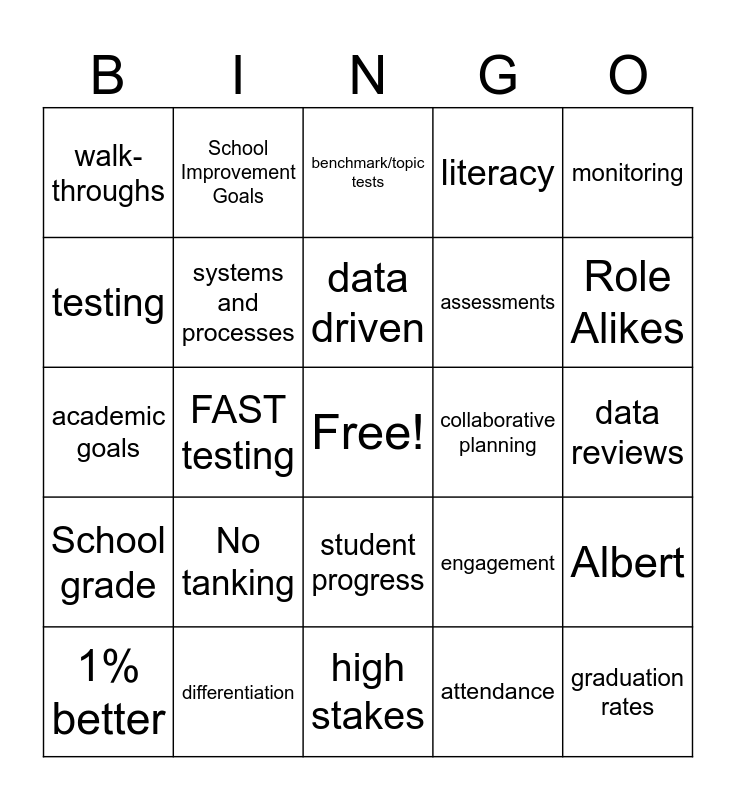 This bingo card has a free space and 24 words: No tanking, differentiation, data driven, 1% better, monitoring, walk-throughs, testing, School Improvement Goals, collaborative planning, student progress, assessments, academic goals, engagement, Albert, systems and processes, attendance, data reviews, benchmark/topic tests, Role Alikes, FAST testing, graduation rates, School grade, literacy and high stakes.