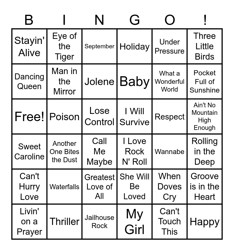 This bingo card has 36 words: She Will Be Loved, Greatest Love of All, My Girl, Dancing Queen, Sweet Caroline, I Will Survive, Man in the Mirror, Jailhouse Rock, Under Pressure, When Doves Cry, Pocket Full of Sunshine, Holiday, Groove is in the Heart, Poison, Baby, Stayin' Alive, Can't Hurry Love, Respect, Free!, September, Lose Control, Another One Bites the Dust, I Love Rock N' Roll, Call Me Maybe, Wannabe, Eye of the Tiger, What a Wonderful World, Thriller, Jolene, Three Little Birds, Happy, Livin' on a Prayer, Rolling in the Deep, Ain't No Mountain High Enough, Waterfalls and Can't Touch This.