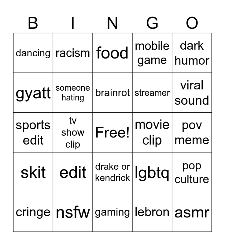This bingo card has a free space and 24 words: edit, nsfw, brainrot, cringe, dark humor, dancing, gyatt, racism, movie clip, drake or kendrick, streamer, sports edit, lgbtq, pop culture, someone hating, lebron, pov meme, food, viral sound, tv show clip, asmr, skit, mobile game and gaming.