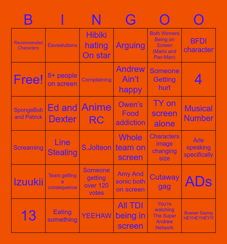This bingo card has 36 words: Screaming, Line Stealing, YEEHAW, Andrew Ain’t happy, TY on screen alone, Musical Number, Recommended Characters, Eating something, Hibiki hating On star, Amy And sonic both on screen, Someone Getting hurt, BFDI character, Izuukii, Ed and Dexter, Complaining, Arguing, Cutaway gag, Arle speaking specifically, Free!, 8+ people on screen, S.Jolteon, Whole team on screen, Characters image changing size, ADs, SpongeBob and Patrick, Eeveelutions, Anime RC, All TDI being in screen, Both Winners Being on Screen (Mario and Pac-Man), 4, 13, Team getting a consequence, Someone getting over 120 votes, Owen’s Food addiction, You’re watching The Super Andrew Network and Bowser Saying HEYHEYHEY!!!.