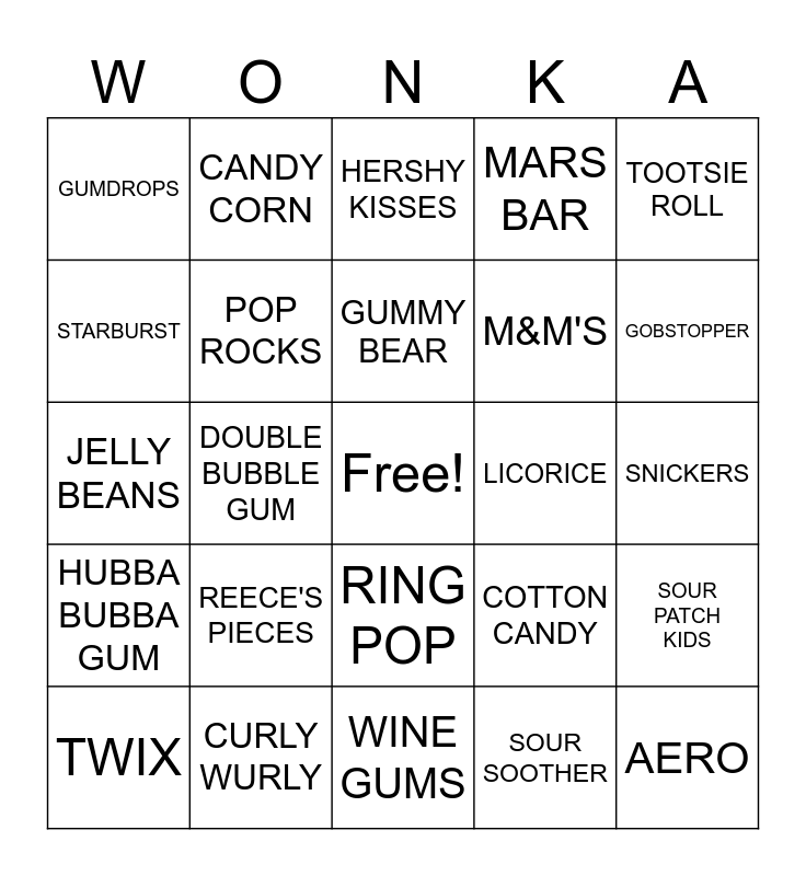 This bingo card has a free space and 24 words: TWIX, REECE'S PIECES, GUMMY BEAR, SOUR SOOTHER, TOOTSIE ROLL, GUMDROPS, CANDY CORN, HERSHY KISSES, LICORICE, SNICKERS, JELLY BEANS, POP ROCKS, COTTON CANDY, SOUR PATCH KIDS, STARBURST, CURLY WURLY, WINE GUMS, MARS BAR, GOBSTOPPER, HUBBA BUBBA GUM, DOUBLE BUBBLE GUM, RING POP, M&M'S and AERO.