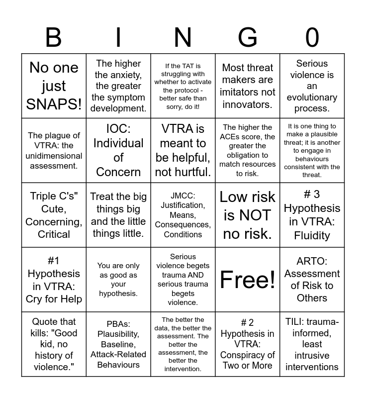 This bingo card has 25 words: You are only as good as your hypothesis., The better the data, the better the assessment. The better the assessment, the better the intervention., VTRA is meant to be helpful, not hurtful., Quote that kills: "Good kid, no history of violence.", Serious violence is an evolutionary process., No one just SNAPS!, The plague of VTRA: the unidimensional assessment., The higher the anxiety, the greater the symptom development., Low risk is NOT no risk., Serious violence begets trauma AND serious trauma begets violence., The higher the ACEs score, the greater the obligation to match resources to risk., Triple C's" Cute, Concerning, Critical, Free!, ARTO: Assessment of Risk to Others, IOC: Individual of Concern, TILI: trauma-informed, least intrusive interventions, # 3 Hypothesis in VTRA: Fluidity, If the TAT is struggling with whether to activate the protocol - better safe than sorry, do it!, It is one thing to make a plausible threat; it is another to engage in behaviours consistent with the threat., Treat the big things big and the little things little., JMCC: Justification, Means, Consequences, Conditions, PBAs: Plausibility, Baseline, Attack-Related Behaviours, #1 Hypothesis in VTRA: Cry for Help, Most threat makers are imitators not innovators. and # 2 Hypothesis in VTRA: Conspiracy of Two or More.