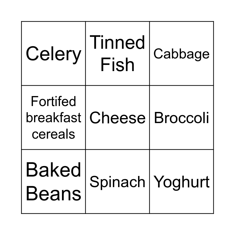 This bingo card has 12 words: Milk, Yoghurt, Cheese, Broccoli, Tinned Fish, Cabbage, Spinach, Brussel Sprouts, Celery, Fortifed breakfast cereals, Baked Beans and Chia seeds.