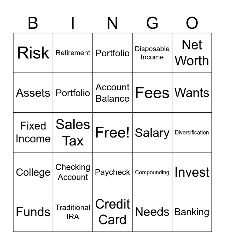 This bingo card has a free space and 49 words: Emergency Fund, Banking, Budgeting, Credit Card, Checking Account, Opportunity Cost, Retirement, Loans, Assets, Savings, Portfolio, Disposable Income, Invest, Compounding, Interest Rate, Money, Account Balance, Salary, Insurance, Net Worth, Sales Tax, Needs, Risk, Fees, Renting, Wants, Funds, Debt, Paycheck, College, 529 Plan, Career, Savings Account, Liabilities, Traditional IRA, Roth IRA, Social Security, Savings Account, Diversification, Stock, Capital Gains, Personal Income Tax, Bond, Employer, Fixed Income, Portfolio, Checkbook, Return and Interest.
