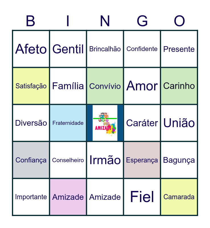 This bingo card has a free space and 33 words: Alegria, Felicidade, Convívio, Lealdade, União, Afeto, Família, Amizade, Amor, Camarada, Satisfação, Gentil, Fiel, Simpatia, Diversão, Fraternidade, Irmão, Esperança, Bagunça, Confiança, Amizade, Irmandade, Confidente, Carinho, Apoio, Conselheiro, Brincalhão, Caráter, Presente, Importante, Atencioso, Verdadeiro and Sincero.