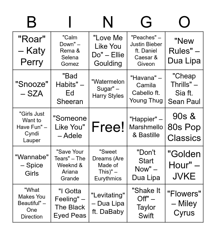 This bingo card has a free space and 51 words: "As It Was" – Harry Styles, "Flowers" – Miley Cyrus, "Anti-Hero" – Taylor Swift, "Levitating" – Dua Lipa ft. DaBaby, "Save Your Tears" – The Weeknd & Ariana Grande, "Good 4 U" – Olivia Rodrigo, "Calm Down" – Rema & Selena Gomez, "Shivers" – Ed Sheeran, "Snooze" – SZA, "abcdefu" – GAYLE, "Bad Habits" – Ed Sheeran, "Peaches" – Justin Bieber ft. Daniel Caesar & Giveon, "Golden Hour" – JVKE, "Don't Start Now" – Dua Lipa, "Montero (Call Me By Your Name)" – Lil Nas X, Blinding Lights" – The Weeknd, "Watermelon Sugar" – Harry Styles, "Happier" – Marshmello & Bastille, "Senorita" – Shawn Mendes & Camila Cabello, "New Rules" – Dua Lipa, "Someone Like You" – Adele, "Shake It Off" – Taylor Swift, "Roar" – Katy Perry, "Havana" – Camila Cabello ft. Young Thug, "Uptown Funk" – Mark Ronson ft. Bruno Mars, "Perfect" – Ed Sheeran, "Cheap Thrills" – Sia ft. Sean Paul, "Closer" – The Chainsmokers ft. Halsey, "What Makes You Beautiful" – One Direction, "Love Me Like You Do" – Ellie Goulding, "Just Dance" – Lady Gaga, "Since U Been Gone" – Kelly Clarkson, "Toxic" – Britney Spears, "Umbrella" – Rihanna ft. Jay-Z, "Crazy in Love" – Beyoncé ft. Jay-Z, "I Gotta Feeling" – The Black Eyed Peas, "Bleeding Love" – Leona Lewis, "Hot N Cold" – Katy Perry, "Apologize" – Timbaland ft. OneRepublic, "Complicated" – Avril Lavigne, 90s & 80s Pop Classics, "Wannabe" – Spice Girls, "Baby One More Time" – Britney Spears, "I Want It That Way" – Backstreet Boys, "Like a Prayer" – Madonna, "Billie Jean" – Michael Jackson, "Girls Just Want to Have Fun" – Cyndi Lauper, "Take On Me" – a-ha, "Every Breath You Take" – The Police, "Sweet Dreams (Are Made of This)" – Eurythmics and "Livin’ on a Prayer" – Bon Jovi.