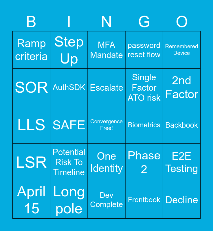 This bingo card has a free space and 24 words: Potential Risk To Timeline, Long pole, Escalate, April 15, Remembered Device, Ramp criteria, SOR, Step Up, Biometrics, One Identity, Single Factor ATO risk, LLS, Phase 2, E2E Testing, AuthSDK, Frontbook, Backbook, MFA Mandate, 2nd Factor, SAFE, Decline, LSR, password reset flow and Dev Complete.