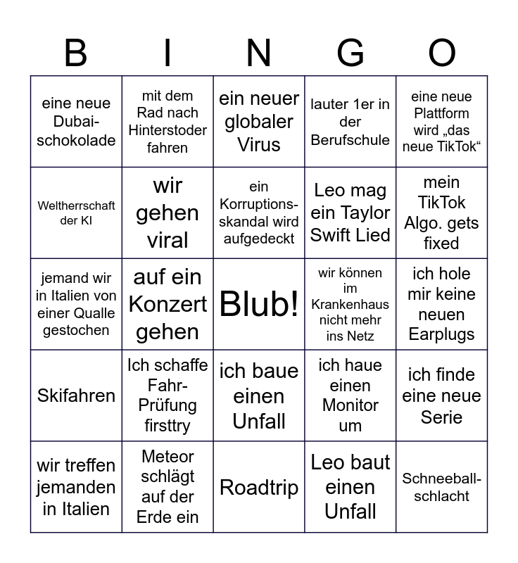 This bingo card has a free space and 24 words: Ich schaffe Fahr-Prüfung firsttry, Meteor schlägt auf der Erde ein, ein Korruptions-skandal wird aufgedeckt, wir treffen jemanden in Italien, eine neue Plattform wird „das neue TikTok“, eine neue Dubai-schokolade, Weltherrschaft der KI, mit dem Rad nach Hinterstoder fahren, wir können im Krankenhaus nicht mehr ins Netz, ich baue einen Unfall, Leo mag ein Taylor Swift Lied, jemand wir in Italien von einer Qualle gestochen, ich haue einen Monitor um, ich finde eine neue Serie, wir gehen viral, Leo baut einen Unfall, ich hole mir keine neuen Earplugs, ein neuer globaler Virus, mein TikTok Algo. gets fixed, auf ein Konzert gehen, Schneeball-schlacht, Skifahren, lauter 1er in der Berufschule and Roadtrip.