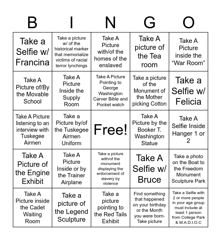 This bingo card has a free space and 24 words: Take A Picture Inside or by the Trainer Airplane, Take a picture of the Legend Sculpture, Take A Picture Pointing to George Washington Carver Bible and Pocket watch, Take A Picture inside the Cadet Waiting Room, Take A Picture inside the “War Room”, Take a Selfie w/ Francina, Take A Picture of/By the Movable School, Take a picture w/ of the historical marker that memorialize victims of racial terror lynchings, Take A Picture by the Booker T. Washington Statue, Take a picture with/of the monument displaying the enforcement of slavery by violence, Take a picture of the Monument of the Mother picking Cotton, Take A Picture listening to an interview with Tuskegee Airmen, Take A Selfie w/ Bruce, Take a photo on the Boat to the Freedom Monument Sculpture Park, Take A Picture Inside the Supply Room, Find something that happened on your birthday or the Month you were born-Take picture, Take A Selfie Inside Hanger 1 or 2, Take A Picture with/of the homes of the enslaved, Take a Selfie w/ Felicia, Take a Picture by/of the Tuskegee Airmen Uniform, Take a Selfie with 2 or more people in your age group must include at least 1 person from College Park & M.A.D.I.O.C, Take A Picture of the Engine Exhibit, Take A picture of the Tea room and Take a picture pointing to the Red Tails Exhibit.