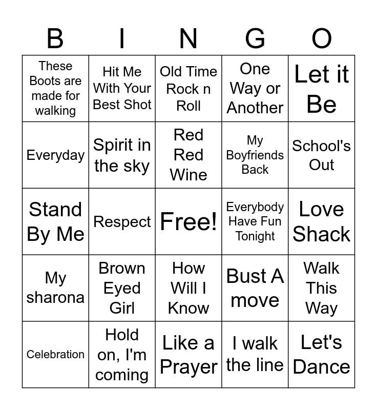 This bingo card has a free space and 24 words: Brown Eyed Girl, Hold on, I'm coming, Red Red Wine, Celebration, Let it Be, These Boots are made for walking, Everyday, Hit Me With Your Best Shot, Everybody Have Fun Tonight, How Will I Know, My Boyfriends Back, Stand By Me, Bust A move, Walk This Way, Spirit in the sky, I walk the line, Love Shack, Old Time Rock n Roll, School's Out, Respect, Let's Dance, My sharona, One Way or Another and Like a Prayer.