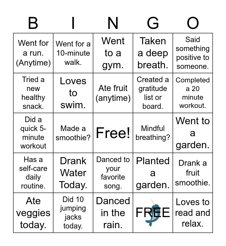This bingo card has 1 images, a free space and 24 words: Drank Water Today., Did 10 jumping jacks today., Ate fruit (anytime), Ate veggies today., Said something positive to someone., Went for a run. (Anytime), Tried a new healthy snack., Went for a 10-minute walk., Mindful breathing?, Danced to your favorite song., Created a gratitude list or board., Did a quick 5-minute workout, Planted a garden., Drank a fruit smoothie., Loves to swim., FREE, Went to a garden., Went to a gym., Completed a 20 minute workout., Made a smoothie?, Loves to read and relax., Has a self-care daily routine., Taken a deep breath. and Danced in the rain..