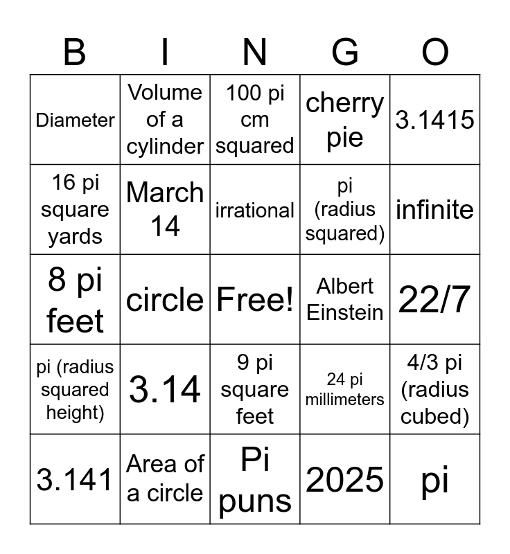 This bingo card has a free space and 24 words: 3.14, Area of a circle, irrational, 3.141, 3.1415, Diameter, 16 pi square yards, Volume of a cylinder, Albert Einstein, 9 pi square feet, pi (radius squared), 8 pi feet, 24 pi millimeters, 4/3 pi (radius cubed), March 14, 2025, 22/7, 100 pi cm squared, infinite, circle, pi, pi (radius squared height), cherry pie and Pi puns.