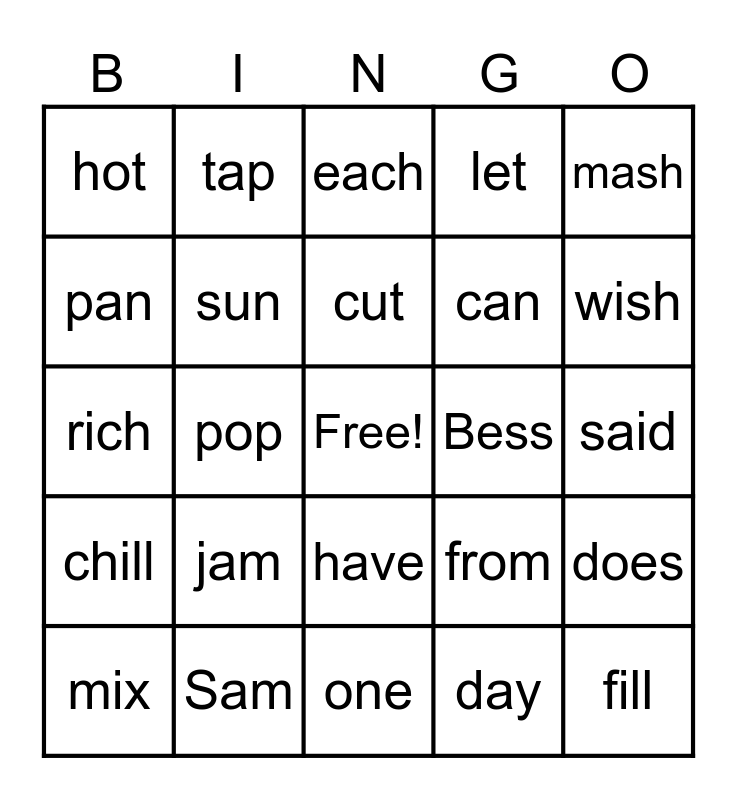 This bingo card has a free space and 24 words: jam, Sam, cut, mix, mash, hot, pan, tap, Bess, have, can, rich, from, does, sun, day, said, each, wish, pop, fill, chill, let and one.