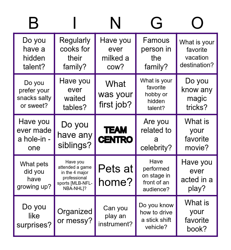 This bingo card has a free space and 54 words: Can money buy happiness?, What pets did you have growing up?, Have you ever gone on a spontaneous trip (less than a week of planning)?, Are you a morning person?, Pets at home?, Pineapple on pizza?, Famous person in the family?, Have you ever won something in a raffle/lottery?, Do you prefer your snacks salty or sweet?, Do you speak other languages?, Do you have a hidden talent?, Ocean or lake?, Organized or messy?, Do you like surprises?, What do you do for self-care?, Can you play an instrument?, What is your favorite book?, What is your favorite hobby or hidden talent?, Do you have family heirlooms or anything passed down through generations?, What is your favorite movie?, Have performed on stage in front of an audience?, Have you won an award or recognition for your work?, Are you related to a celebrity?, What is your favorite vacation destination?, Do or have you played any sports?, Regularly cooks for their family?, Lived in more than one state?, Have you ever lived in a different country?, Parents grew up in a different country?, Do you know how to drive a stick shift vehicle?, Have you been to a Broadway show ?, Have you ever baked anything from scratch?, What is your "specialty" recipe that you cook?, Have you ever gone to the Movie Theater by yourself?, Have you ever milked a cow?, Have you ever finished a Rubix Cube, Have you ever made a hole-in -one, Have you ever acted in a play?, Have you ever met a celebrity?, Have you ever waited tables?, Have you ever worked in a Kitchen?, Have you ever been Scuba-Diving?, Have you ever jumped out of a plane?, Who is the first person you would call if you won the lottery?, Have you attended a game in the 4 major professional sports [MLB-NFL-NBA-NHL]?, Do you attempt the WORDLE most days ?, What is your favorite band or genre of music?, What is the most adventurous food you have eaten?, What was your first job?, Do you have any siblings?, Do you know any magic tricks?, Can you perform a card trick?, What is your favorite/comfort TV show? and Favorite concert?.