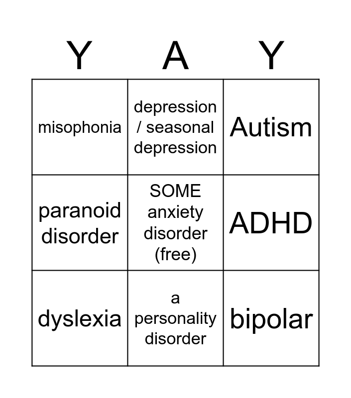 This bingo card has a free space and 8 words: ADHD, Autism, depression / seasonal depression, dyslexia, misophonia, bipolar, paranoid disorder and a personality disorder.