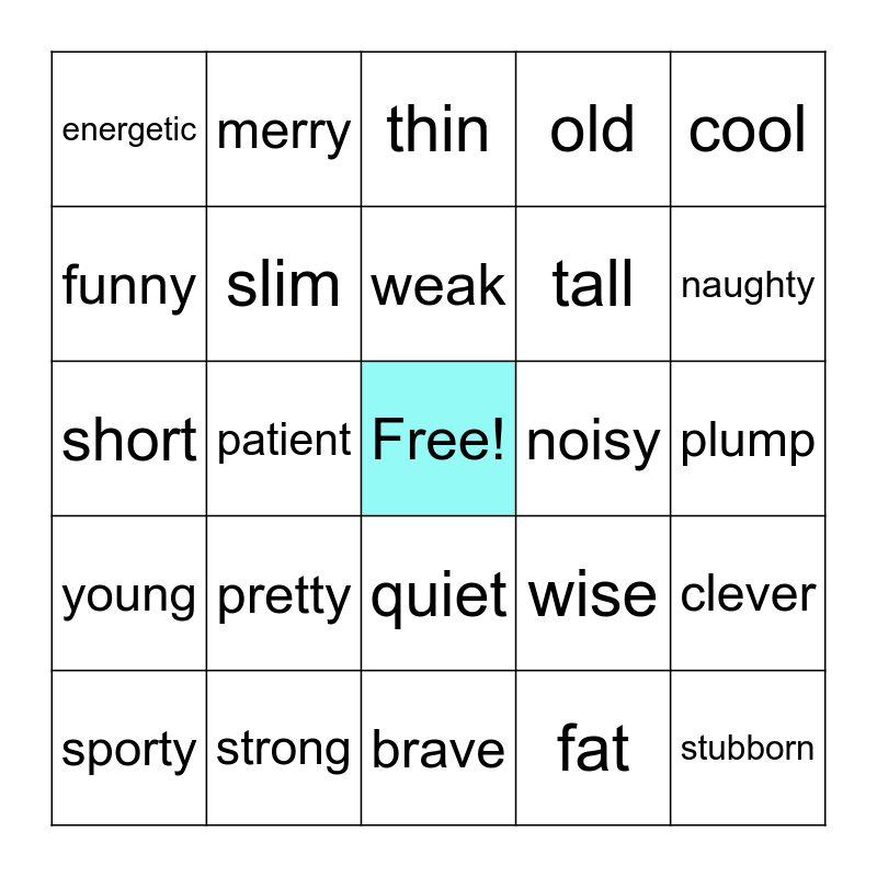 This bingo card has a free space and 24 words: pretty, strong, weak, sporty, cool, energetic, funny, merry, noisy, quiet, tall, short, wise, clever, slim, fat, plump, thin, naughty, patient, stubborn, young, old and brave.