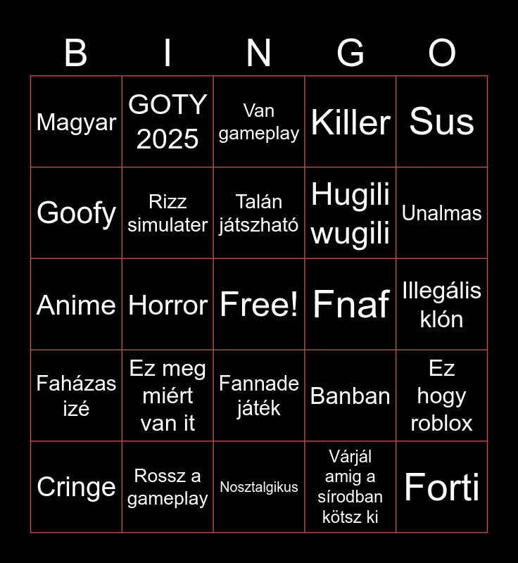This bingo card has a free space and 24 words: Ez meg miért van it, Rossz a gameplay, Talán játszható, Cringe, Sus, Magyar, Goofy, GOTY 2025, Fnaf, Fannade játék, Hugili wugili, Anime, Banban, Ez hogy roblox, Rizz simulater, Várjál amig a sírodban kötsz ki, Illegális klón, Van gameplay, Unalmas, Horror, Forti, Faházas izé, Killer and Nosztalgikus.