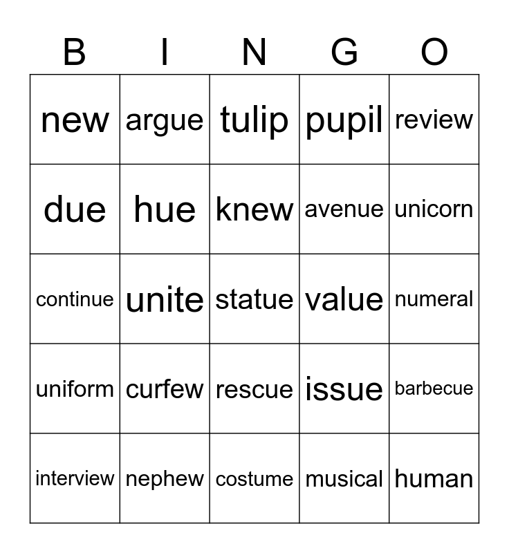 This bingo card has a free space and 24 words: curfew, nephew, knew, interview, review, new, due, argue, value, rescue, avenue, continue, issue, barbecue, hue, musical, numeral, tulip, unicorn, unite, human, uniform, pupil and costume.