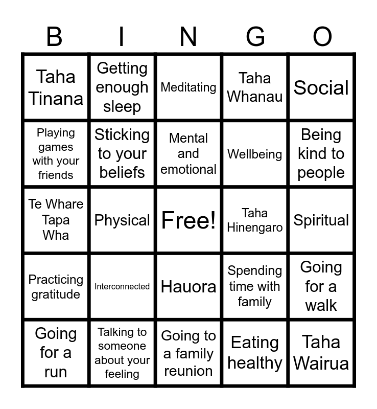 This bingo card has a free space and 24 words: Interconnected, Talking to someone about your feeling, Mental and emotional, Going for a run, Social, Taha Tinana, Playing games with your friends, Getting enough sleep, Taha Hinengaro, Hauora, Wellbeing, Te Whare Tapa Wha, Spending time with family, Going for a walk, Sticking to your beliefs, Eating healthy, Spiritual, Meditating, Being kind to people, Physical, Taha Wairua, Practicing gratitude, Taha Whanau and Going to a family reunion.