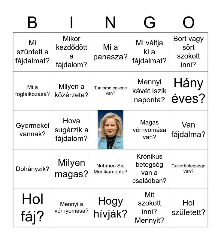 This bingo card has a free space and 29 words: Hol fáj?, Milyen jellegű a fajdalom?, Hova sugárzik a fájdalom?, Milyen gyakran fáj?, Mi szünteti a fájdalmat?, Mi a panasza?, Milyen a közérzete?, Milyen magas?, Magas vérnyomása van?, Mennyi a vérnyomása?, Van fájdalma?, Hol született?, Hogy hívják?, Mit szokott inni? Mennyit?, Hány éves?, Mennyi ideig tart?, Nehmen Sie Medikamente?, Dohányzik?, Bort vagy sört szokott inni?, Gyermekei vannak?, Krónikus betegség van a családban?, Házas?, Mennyi kávét iszik naponta?, Mi a foglalkozása?, Mi váltja ki a fájdalmat?, Mikor kezdődött a fájdalom?, Cukorbetegsége van?, Tumorbetegsége van? and Mennyi a láza?.
