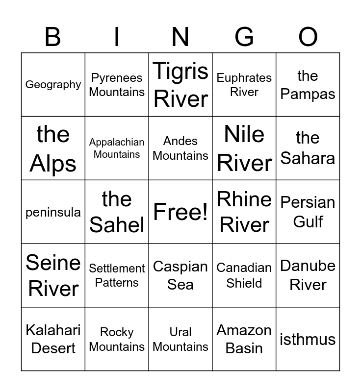 This bingo card has a free space and 27 words: Mississippi River, Rocky Mountains, Andes Mountains, Amazon Basin, the Pampas, the Alps, Pyrenees Mountains, Ural Mountains, Rhine River, Danube River, Seine River, Appalachian Mountains, Canadian Shield, isthmus, peninsula, Zagros Mountains, Tigris River, Euphrates River, Persian Gulf, Geography, Settlement Patterns, Caspian Sea, Nile River, the Sahara, Kalahari Desert, the Sahel and Congo River Basin.
