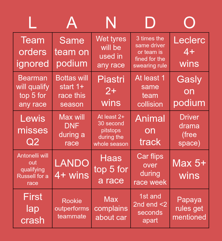 This bingo card has 38 words: Free!, Perez starts 1+ race this season, Kick scoring points, Bottas will start 1+ race this season, Max 5+ wins, LANDO 4+ wins, Piastri 2+ wins, Sainz 3+ DNFs, Leclerc 4+ wins, At least 1 same team collision, Max will DNF during a race, 3 times the same driver or team is fined for the swearing rule, At least 2+ 30 second pitstops during the whole season, Driver drama (free space), Bearman will qualify top 5 for any race, Antonelli will out qualifying Russell for a race, McLaren 1, 2 for a race, Wet tyres will be used in any race, Driver complains about tyres, Animal on track, Team orders ignored, Rookie outperforms teammate, Gasly on podium, First lap crash, Double team DNF in same race, Max complains about car, Papaya rules get mentioned, George makes funny commentary in a race, Sainz top 5 for a race, 6+ cars DNF by end of race, Pit lane start for any driver, Haas top 5 for a race, 1st and 2nd end <2 seconds apart, Same team on podium, Same team DNF, Car flips over during race week, Lewis misses Q2 and Kick makes Q3.