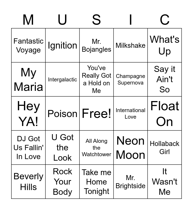 This bingo card has a free space and 75 words: Thunderstruck, I Was Made for Lovin' You, Mr. Bojangles, How Deep is Your Love, All Your'n, Pretty Little Poison, Pretty Fly for a White Guy, Big Poppa, Never Say Goodbye, End of the Road, One Sweet Day, Daddy's Home, You've Really Got a Hold on Me, My Maria, She's My Kind of Rain, Poison, Ice Ice Baby, It Wasn't Me, Maria Maria, What's Up, Informer, Hey YA!, Intergalactic, Ignition, Milkshake, Suga Suga, Twisted, Home, Ring of Fire, Sweet Home Alabama, A Thousand Miles from Nowhere, One Margarita, Buy Me a Boat, Neon Moon, Say it Ain't So, Champagne Supernova, Secrets, Wicked Games, Float On, Mr. Brightside, Yeah!, Sexy and I know It, Dirty Diana, Raise Up, Fire Away, 23, Beverly Hills, Fantastic Voyage, Paint it, Black, Rebel Yell, Stairway to Heaven, All Along the Watchtower, Miles On It, Die With A Smile, Heads Carolina, Tails California, The Devil Went down to Georgia, Fast Car, Indian Outlaw, 5-1-5-0, Roxanne, U Got the Look, To Be With You, East Bound and Down, Take me home, Country Roads, When you Were Young, International Love, Uma Thurman, Disturbia, Turn down for what, Hollaback Girl, DJ Got Us Fallin' In Love, Rock Your Body, The Reaper, Take me Home Tonight and Juke Box Hero.