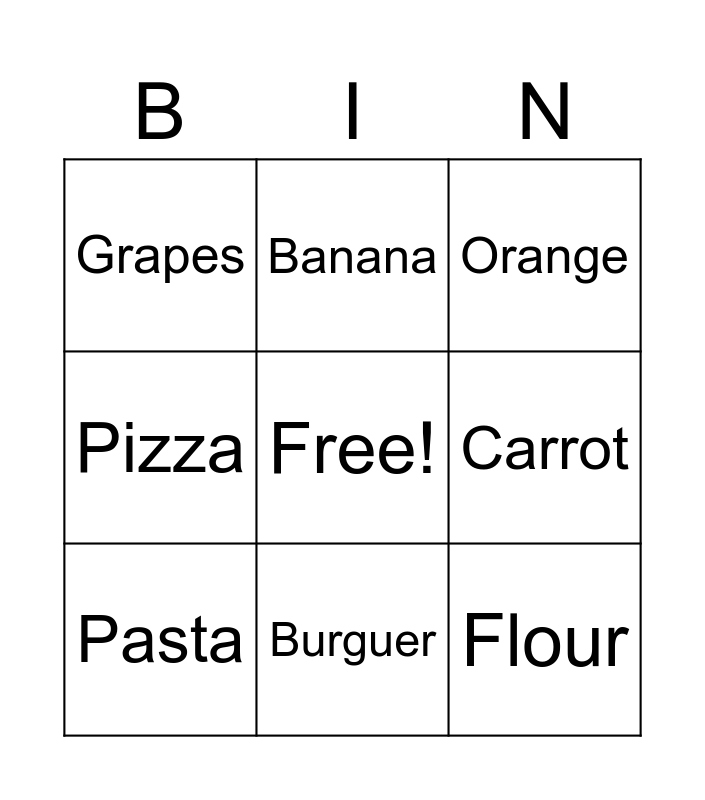This bingo card has a free space and 8 words: Carrot, Orange, Banana, Pasta, Grapes, Flour, Pizza and Burguer.