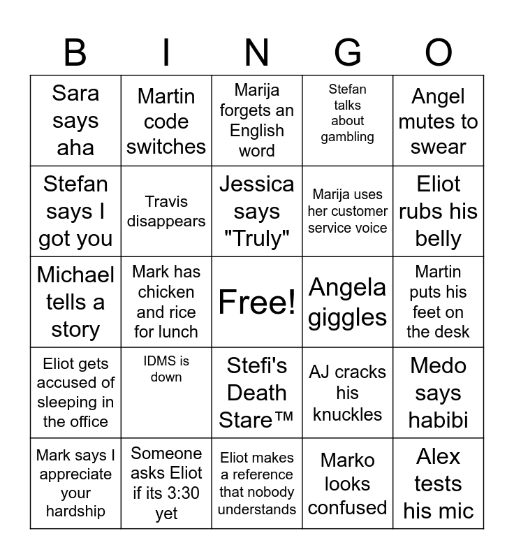 This bingo card has a free space and 24 words: IDMS is down, Someone asks Eliot if its 3:30 yet, Jessica says "Truly", Mark says I appreciate your hardship, Angel mutes to swear, Sara says aha, Stefan says I got you, Martin code switches, Angela giggles, Stefi's Death Stare™, Marija uses her customer service voice, Michael tells a story, AJ cracks his knuckles, Medo says habibi, Travis disappears, Marko looks confused, Martin puts his feet on the desk, Marija forgets an English word, Eliot rubs his belly, Mark has chicken and rice for lunch, Alex tests his mic, Eliot gets accused of sleeping in the office, Stefan talks about gambling and Eliot makes a reference that nobody understands.