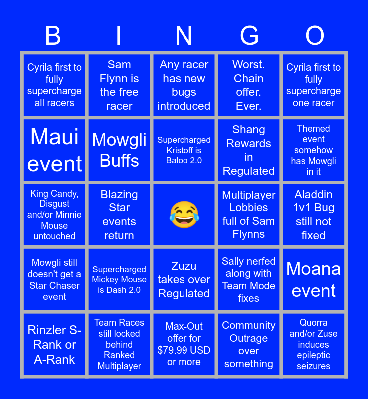 This bingo card has a free space and 24 words: Rinzler S-Rank or A-Rank, Supercharged Mickey Mouse is Dash 2.0, Supercharged Kristoff is Baloo 2.0, Community Outrage over something, Cyrila first to fully supercharge one racer, Cyrila first to fully supercharge all racers, Sam Flynn is the free racer, Any racer has new bugs introduced, Multiplayer Lobbies full of Sam Flynns, Aladdin 1v1 Bug still not fixed, King Candy, Disgust and/or Minnie Mouse untouched, Mowgli Buffs, Sally nerfed along with Team Mode fixes, Moana event, Maui event, Team Races still locked behind Ranked Multiplayer, Max-Out offer for $79.99 USD or more, Worst. Chain offer. Ever., Themed event somehow has Mowgli in it, Mowgli still doesn't get a Star Chaser event, Blazing Star events return, Zuzu takes over Regulated, Shang Rewards in Regulated and Quorra and/or Zuse induces epileptic seizures.