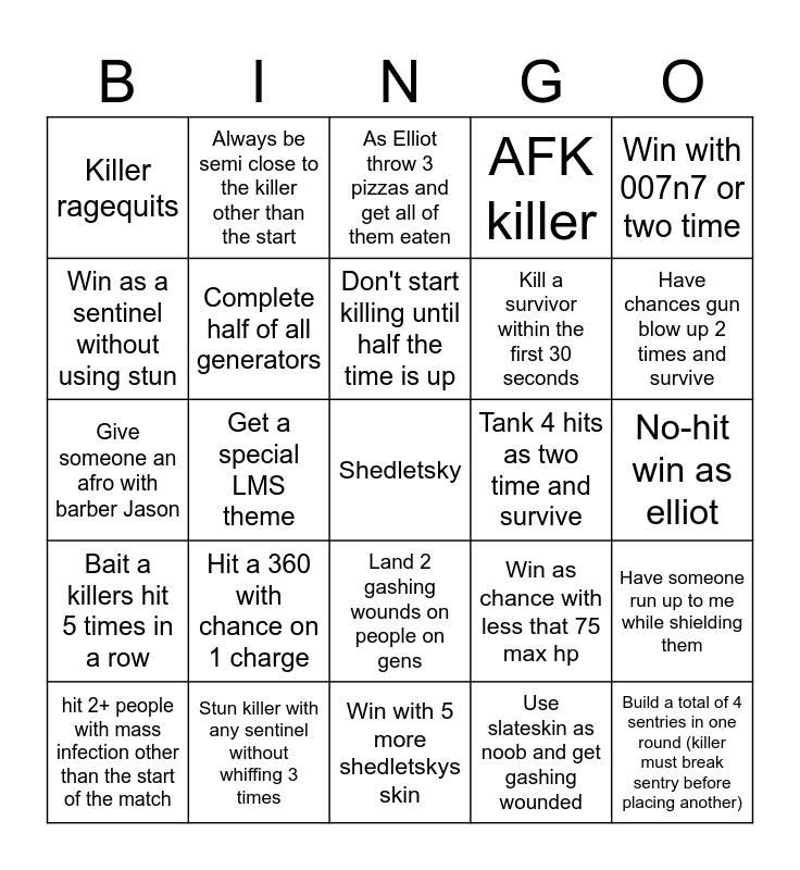 This bingo card has a free space and 24 words: Hit a 360 with chance on 1 charge, Stun killer with any sentinel without whiffing 3 times, Don't start killing until half the time is up, hit 2+ people with mass infection other than the start of the match, Win with 007n7 or two time, Killer ragequits, Win as a sentinel without using stun, Always be semi close to the killer other than the start, Tank 4 hits as two time and survive, Land 2 gashing wounds on people on gens, Kill a survivor within the first 30 seconds, Give someone an afro with barber Jason, Win as chance with less that 75 max hp, Have someone run up to me while shielding them, Complete half of all generators, Use slateskin as noob and get gashing wounded, No-hit win as elliot, As Elliot throw 3 pizzas and get all of them eaten, Have chances gun blow up 2 times and survive, Get a special LMS theme, Build a total of 4 sentries in one round (killer must break sentry before placing another), Bait a killers hit 5 times in a row, AFK killer and Win with 5 more shedletskys skin.