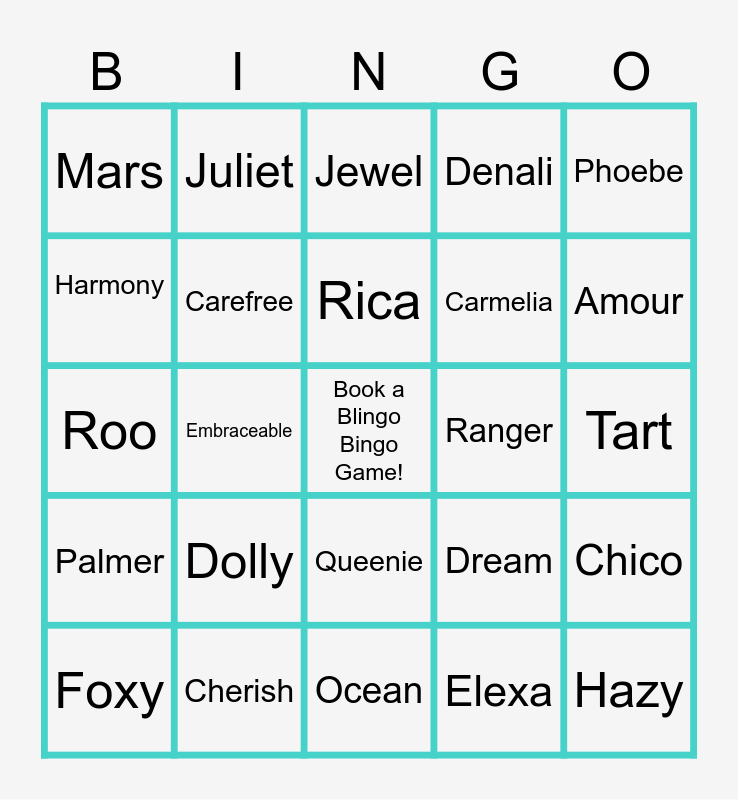 This bingo card has a free space and 24 words: Dolly, Cherish, Rica, Foxy, Phoebe, Mars, Harmony, Juliet, Ranger, Queenie, Carmelia, Roo, Dream, Chico, Carefree, Elexa, Tart, Jewel, Amour, Embraceable, Hazy, Palmer, Denali and Ocean.