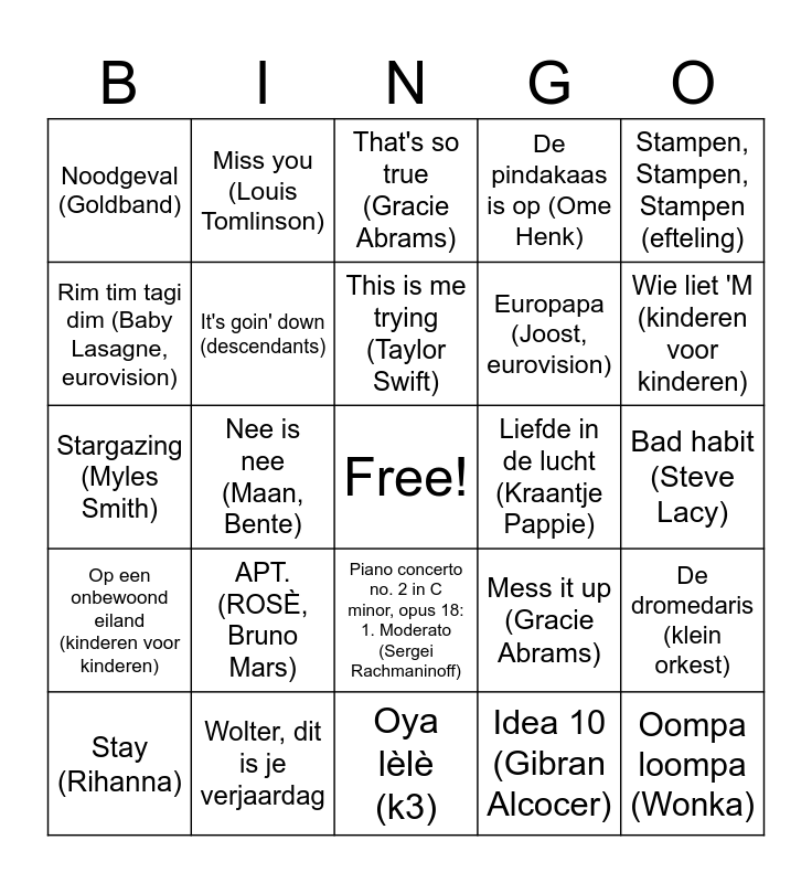 This bingo card has a free space and 85 words: Black and white (Niall Horan), I always wanted a brother (mufasa), That's so true (Gracie Abrams), Dancing through life (wicked), Te laat (k3), Too much (Dove Cameron), Space between (descendants), Born with a broken heart (damiano david), Messy (Lola Young), Psycho (Goldband), Other side (The greatest showman), Surface pressure (encanto), It's goin' down (descendants), Liefde in de lucht (Kraantje Pappie), Nacht (Guus Meeuwis, Kraantje Pappie), Noodgeval (Goldband), Stay (Rihanna), Rim tim tagi dim (Baby Lasagne, eurovision), Love is an open door (Frozen), Doomsday Blue (Bambie Thug, eurovision), The pi song (AsapSCIENCE), Europapa (Joost, eurovision), Oompa loompa (Wonka), Viva la vida (Coldplay), Nee is nee (Maan, Bente), Prince Ali (Aladdin), High Hopes (Panic! At the disco), Heksen Nieuwjaar (Foeksia de miniheks), Stitches (Shawn Mendes), Mercy (Shawn Mendes), APT. (ROSÈ, Bruno Mars), Sugardaddy (Roxy Dekker), Terug in de tijd (Yves Berendse), Stargazing (Myles Smith), Counting stars (OneRepublic), C'est la vie (Claude, eurovision), Oya lèlè (k3), Lekker eigenwijs (kinderen voor kinderen), Op een onbewoond eiland (kinderen voor kinderen), Wie liet 'M (kinderen voor kinderen), Niets is cooler dan kerstmis (kinderen voor kinderen), Pina Colada (k3), Nos vamos a la cama (minidisco), As it was (Harry Styles), Heaven (Niall Horan), Slow hands (Niall Horan), C'mon C'mon (One Direction), Daylight (David Kushner), Psychosocial (Slipknot), Imaginary (Evanescence), Miss you (Louis Tomlinson), This is me trying (Taylor Swift), Forever Winter (Taylor Swift), Niet verjaardagsfeest (K3), Waar ben je? (Mindvakantie), Viervoeters (Miss Montreal), Wolter, dit is je verjaardag, De pindakaas is op (Ome Henk), Dark side (Blind Channel, eurovision), Verb aller, Max en moritz (smerige tosti), World of the dream (Sefa, Dr. Peacock), School song (matilda), Ha, Ha, Ha, Je vader (kinderen voor kinderen), Queen of kings (Alessandra, eurovision), Stampen, Stampen, Stampen (efteling), Hout hakken (houthakker Willem, efteling), De dromedaris (klein orkest), Strand (Boudewijn de Groot), Piano man (Billy joel), One day / Reckoning song (Asaf Avidan, The Mojos, Wankelmut), Good to be (Mark Ambor), Ali Baba (K3), HOT TO GO! (Chappell Roan), Seven tears are flowing to the river (nargaroth), Piano concerto no. 2 in C minor, opus 18: 1. Moderato (Sergei Rachmaninoff), Idea 10 (Gibran Alcocer), Undecided (Rondé), SUPERMODEL (Måneskin), Take on me (a-ha), Bad habit (Steve Lacy), Heat waves (Glass Animals), Paper crown (Alec Benjamin), Mess it up (Gracie Abrams) and I know it won't work (Gracie Abrams).