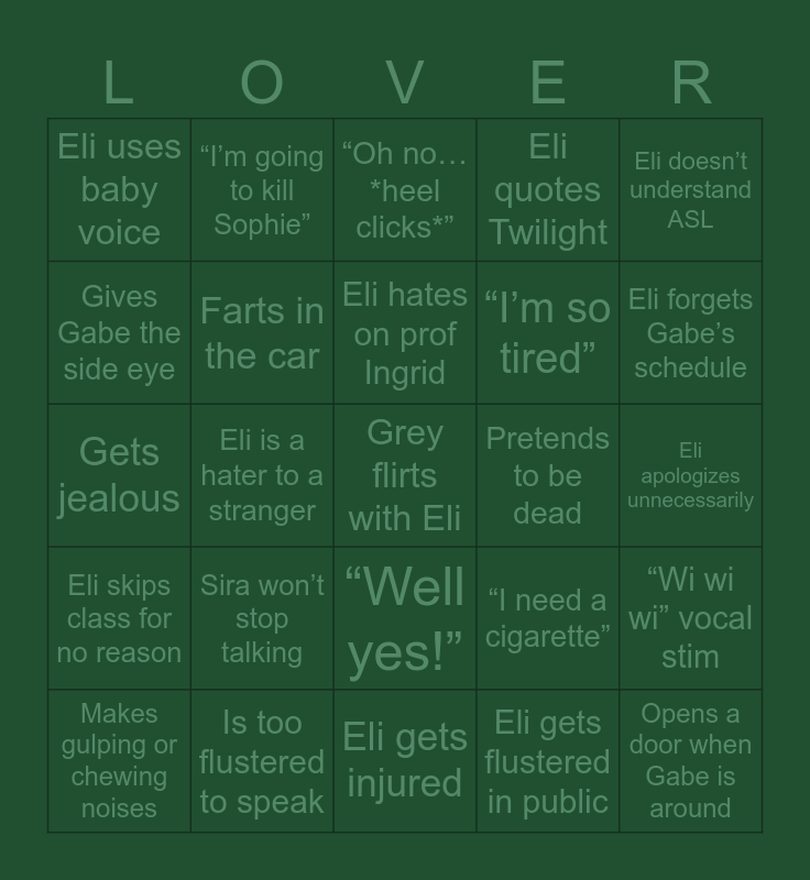 This bingo card has 25 words: Sira won’t stop talking, Eli gets injured, Eli hates on prof Ingrid, Makes gulping or chewing noises, Eli doesn’t understand ASL, Eli uses baby voice, Gives Gabe the side eye, “I’m going to kill Sophie”, Pretends to be dead, “Well yes!”, “I’m so tired”, Gets jealous, “I need a cigarette”, “Wi wi wi” vocal stim, Farts in the car, Opens a door when Gabe is around, Eli apologizes unnecessarily, “Oh no…*heel clicks*”, Eli forgets Gabe’s schedule, Eli is a hater to a stranger, Grey flirts with Eli, Is too flustered to speak, Eli skips class for no reason, Eli quotes Twilight and Eli gets flustered in public.