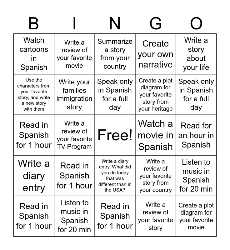 This bingo card has a free space and 24 words: Read in Spanish for 1 hour, Listen to music in Spanish for 20 min, Speak only in Spanish for a full day, Read in Spanish for 1 hour, Write a story about your life, Watch cartoons in Spanish, Use the characters from your favorite story, and write a new story with them, Write a review of your favorite movie, Watch a movie in Spanish, Write a diary entry. What did you do today that was different than in the USA?, Create a plot diagram for your favorite story from your heritage, Read in Spanish for 1 hour, Write a review of your favorite story from your country, Listen to music in Spanish for 20 min, Write your families immigration story, Write a review of your favorite story, Read for an hour in Spanish, Summarize a story from your country, Speak only in Spanish for a full day, Write a review of your favorite TV Program, Create a plot diagram for your favorite movie, Write a diary entry, Create your own narrative and Read in Spanish for 1 hour.