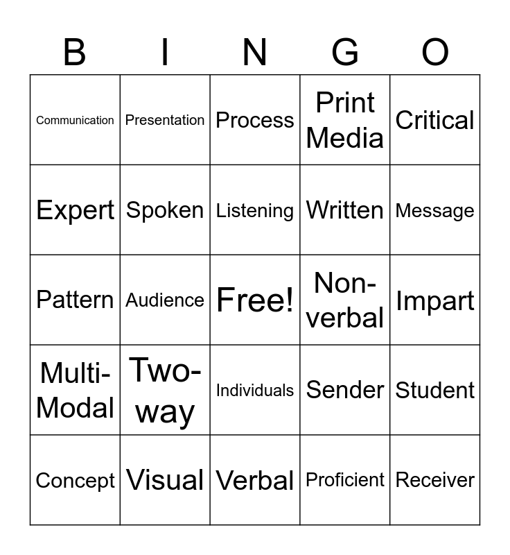This bingo card has a free space and 30 words: Visual, Advanced, Audience, Novice, Communication, Process, Spoken, Individuals, Non-verbal, Verbal, Impart, Receiver, Proficient, Empathy, Message, Digital, Sender, Multi-Modal, Two-way, Critical, Pattern, Author, Presentation, Written, Expert, Print Media, Student, Concept, Listening and Skills.