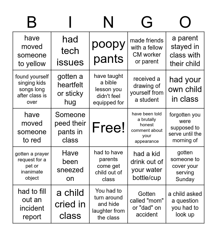 This bingo card has a free space and 29 words: had to fill out an incident report, told a story about mom and dad they probably shouldn't have, Someone peed their pants in class, spotted a child with shoes on the wrong feet, have moved someone to yellow, poopy pants, gotten a heartfelt or sticky hug, Have been sneezed on, have been told a brutally honest comment about your appearance, a child cried in class, forgotten you were supposed to serve until the morning of, a child asked a question you had to look up, You had to turn around and hide laughter from the class, Gotten called "mom" or "dad" on accident, had your own child in class, have been asked if animals go to heaven, had to have parents come get child out of class, gotten a prayer request for a pet or inanimate object, a parent stayed in class with their child, have moved someone to red, had a kid drink out of your water bottle/cup, had to explain that we don't lick classroom supplies / toys, received a drawing of yourself from a student, found yourself singing kids songs long after class is over, made friends with a fellow CM worker or parent, had tech issues, gotten someone to cover your serving Sunday, have taught a bible lesson you didn't feel equipped for and accidentally brought supplies/toys home.