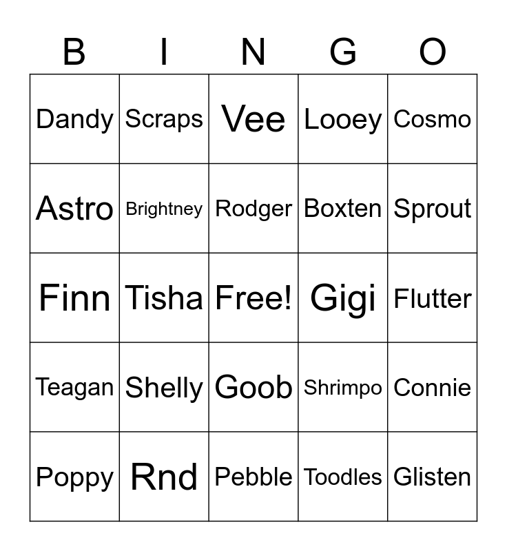 This bingo card has a free space and 24 words: Shelly, Rnd, Rodger, Poppy, Cosmo, Dandy, Astro, Scraps, Gigi, Goob, Boxten, Finn, Shrimpo, Connie, Brightney, Toodles, Flutter, Vee, Sprout, Tisha, Glisten, Teagan, Looey and Pebble.