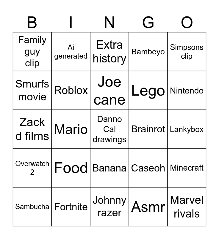This bingo card has a free space and 24 words: Food, Fortnite, Joe cane, Sambucha, Simpsons clip, Family guy clip, Smurfs movie, Ai generated, Brainrot, Banana, Lego, Zack d films, Caseoh, Minecraft, Roblox, Asmr, Lankybox, Extra history, Nintendo, Mario, Marvel rivals, Overwatch 2, Bambeyo and Johnny razer.