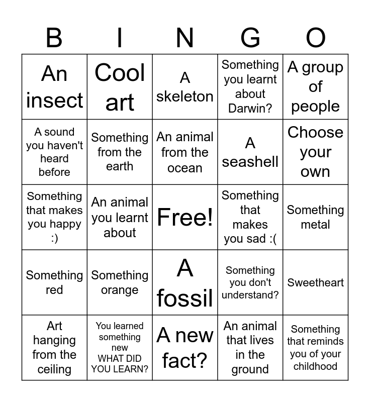 This bingo card has a free space and 24 words: Something orange, You learned something new WHAT DID YOU LEARN?, An animal from the ocean, Art hanging from the ceiling, A group of people, An insect, A sound you haven't heard before, Cool art, Something that makes you sad :(, A fossil, A seashell, Something that makes you happy :), Something you don't understand?, Sweetheart, Something from the earth, An animal that lives in the ground, Something metal, A skeleton, Choose your own, An animal you learnt about, Something that reminds you of your childhood, Something red, Something you learnt about Darwin? and A new fact?.