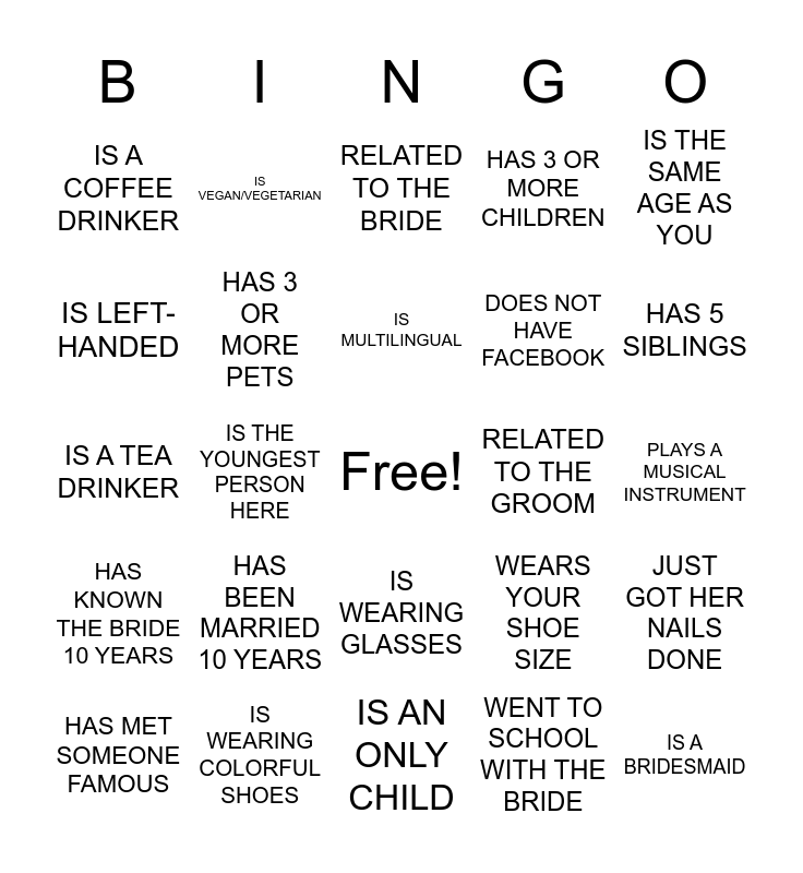 This bingo card has a free space and 24 words: HAS BEEN MARRIED 10 YEARS, IS WEARING COLORFUL SHOES, IS MULTILINGUAL, HAS MET SOMEONE FAMOUS, IS THE SAME AGE AS YOU, IS A COFFEE DRINKER, IS LEFT-HANDED, IS VEGAN/VEGETARIAN, RELATED TO THE GROOM, IS WEARING GLASSES, DOES NOT HAVE FACEBOOK, IS A TEA DRINKER, WEARS YOUR SHOE SIZE, JUST GOT HER NAILS DONE, HAS 3 OR MORE PETS, WENT TO SCHOOL WITH THE BRIDE, PLAYS A MUSICAL INSTRUMENT, RELATED TO THE BRIDE, HAS 5 SIBLINGS, IS THE YOUNGEST PERSON HERE, IS A BRIDESMAID, HAS KNOWN THE BRIDE 10 YEARS, HAS 3 OR MORE CHILDREN and IS AN ONLY CHILD.