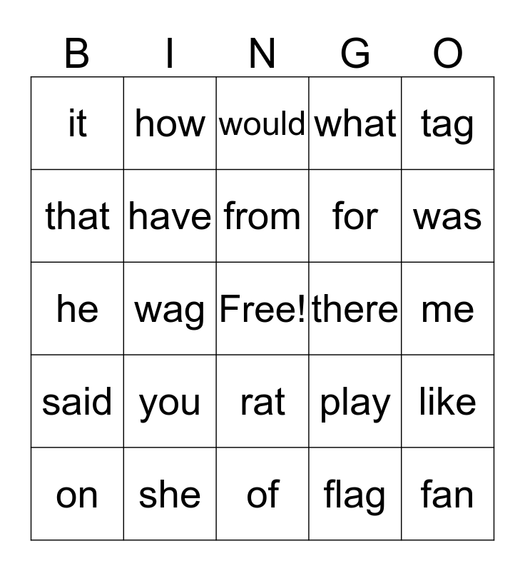 This bingo card has a free space and 27 words: play, and, for, of, that, would, how, said, there, like, he, what, on, she, was, come, have, from, you, it, me, flag, wag, fan, rat, tag and that.