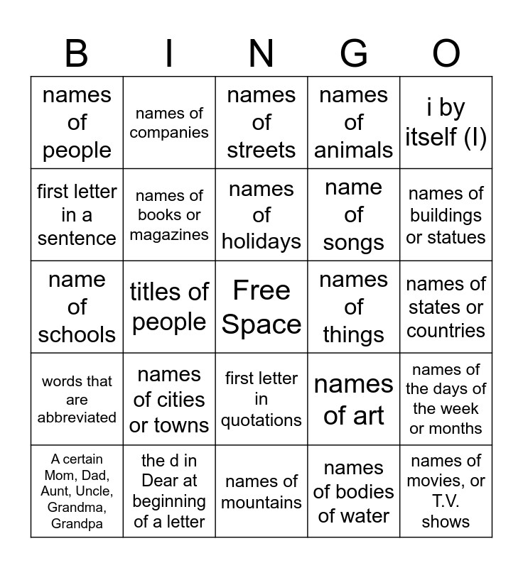 This bingo card has a free space and 24 words: names of cities or towns, the d in Dear at beginning of a letter, names of holidays, A certain Mom, Dad, Aunt, Uncle, Grandma, Grandpa, i by itself (I), names of people, first letter in a sentence, names of companies, names of things, first letter in quotations, name of songs, name of schools, names of art, names of the days of the week or months, names of books or magazines, names of bodies of water, names of states or countries, names of streets, names of buildings or statues, titles of people, names of movies, or T.V. shows, words that are abbreviated, names of animals and names of mountains.