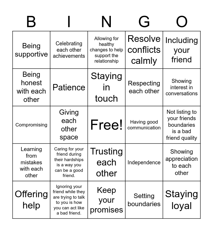This bingo card has a free space and 24 words: Caring for your friend during their hardships is a way you can be a good friend., Ignoring your friend while they are trying to talk to you is how you can act like a bad friend., Staying in touch, Offering help, Including your friend, Being supportive, Being honest with each other, Celebrating each other achievements, Having good communication, Trusting each other, Respecting each other, Compromising, Independence, Showing appreciation to each other, Patience, Setting boundaries, Not listing to your friends boundaries is a bad friend quality, Allowing for healthy changes to help support the relationship, Showing interest in conversations, Giving each other space, Staying loyal, Learning from mistakes with each other, Resolve conflicts calmly and Keep your promises.
