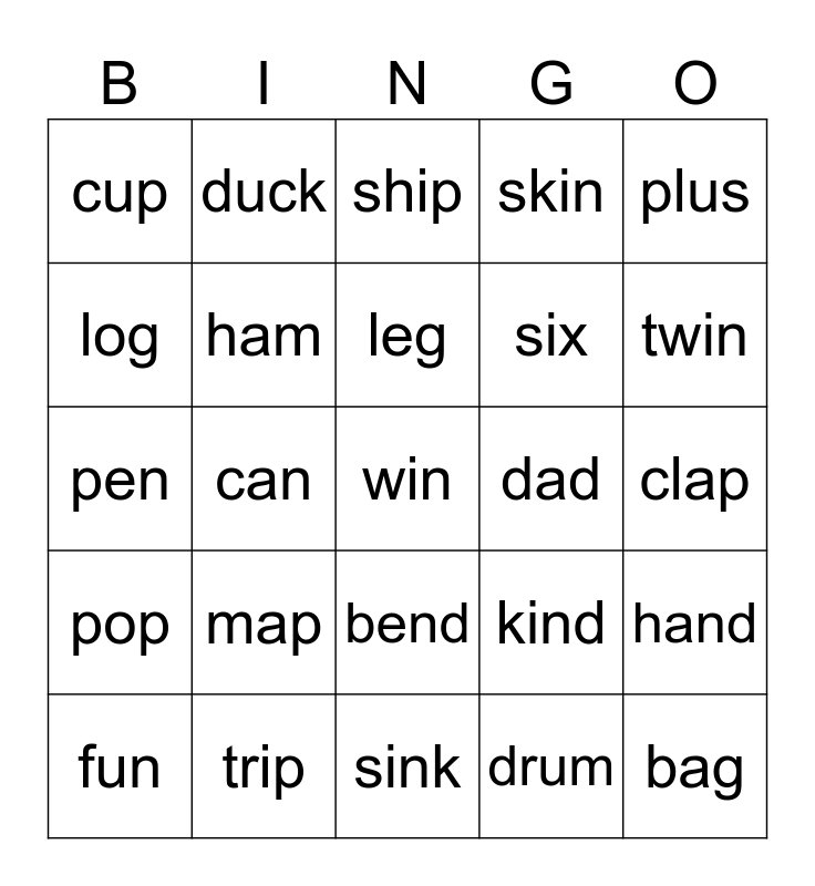 This bingo card has a free space and 24 words: map, trip, leg, fun, plus, cup, log, duck, dad, bend, six, pen, kind, hand, ham, drum, clap, ship, twin, can, bag, pop, skin and sink.