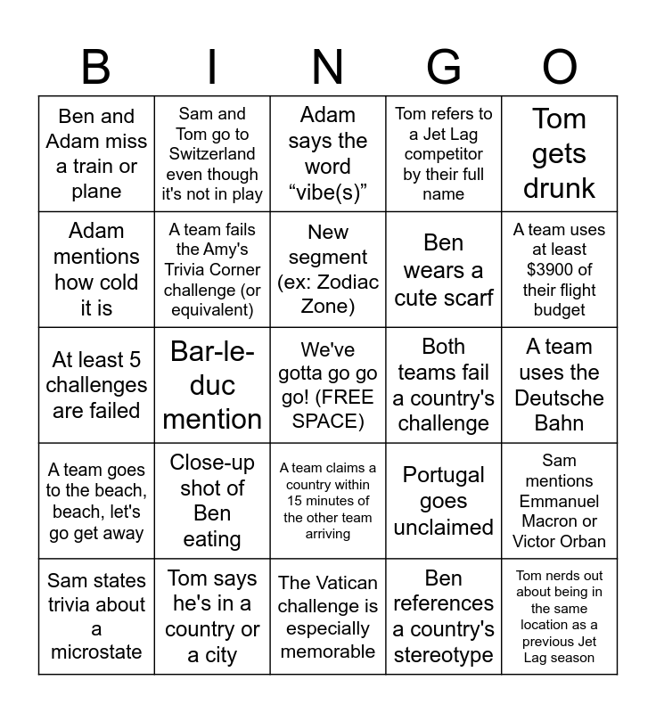 This bingo card has a free space and 24 words: Close-up shot of Ben eating, Tom says he's in a country or a city, New segment (ex: Zodiac Zone), Sam states trivia about a microstate, Tom gets drunk, Ben and Adam miss a train or plane, Adam mentions how cold it is, Sam and Tom go to Switzerland even though it's not in play, Both teams fail a country's challenge, A team claims a country within 15 minutes of the other team arriving, Ben wears a cute scarf, At least 5 challenges are failed, Portugal goes unclaimed, Sam mentions Emmanuel Macron or Victor Orban, A team fails the Amy's Trivia Corner challenge (or equivalent), Ben references a country's stereotype, A team uses the Deutsche Bahn, Adam says the word “vibe(s)”, A team uses at least $3900 of their flight budget, Bar-le-duc mention, Tom nerds out about being in the same location as a previous Jet Lag season, A team goes to the beach, beach, let's go get away, Tom refers to a Jet Lag competitor by their full name and The Vatican challenge is especially memorable.