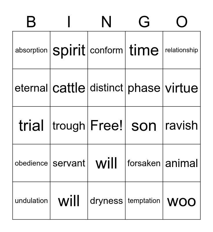This bingo card has a free space and 29 words: undulation, amphibian, trough, peak, absorption, conform, cattle, servant, son, will, ravish, woo, dryness, temptation, virtue, vice, will, obedience, relationship, trial, forsaken, incentive, phase, eternal, time, spirit, animal, distinct and united.